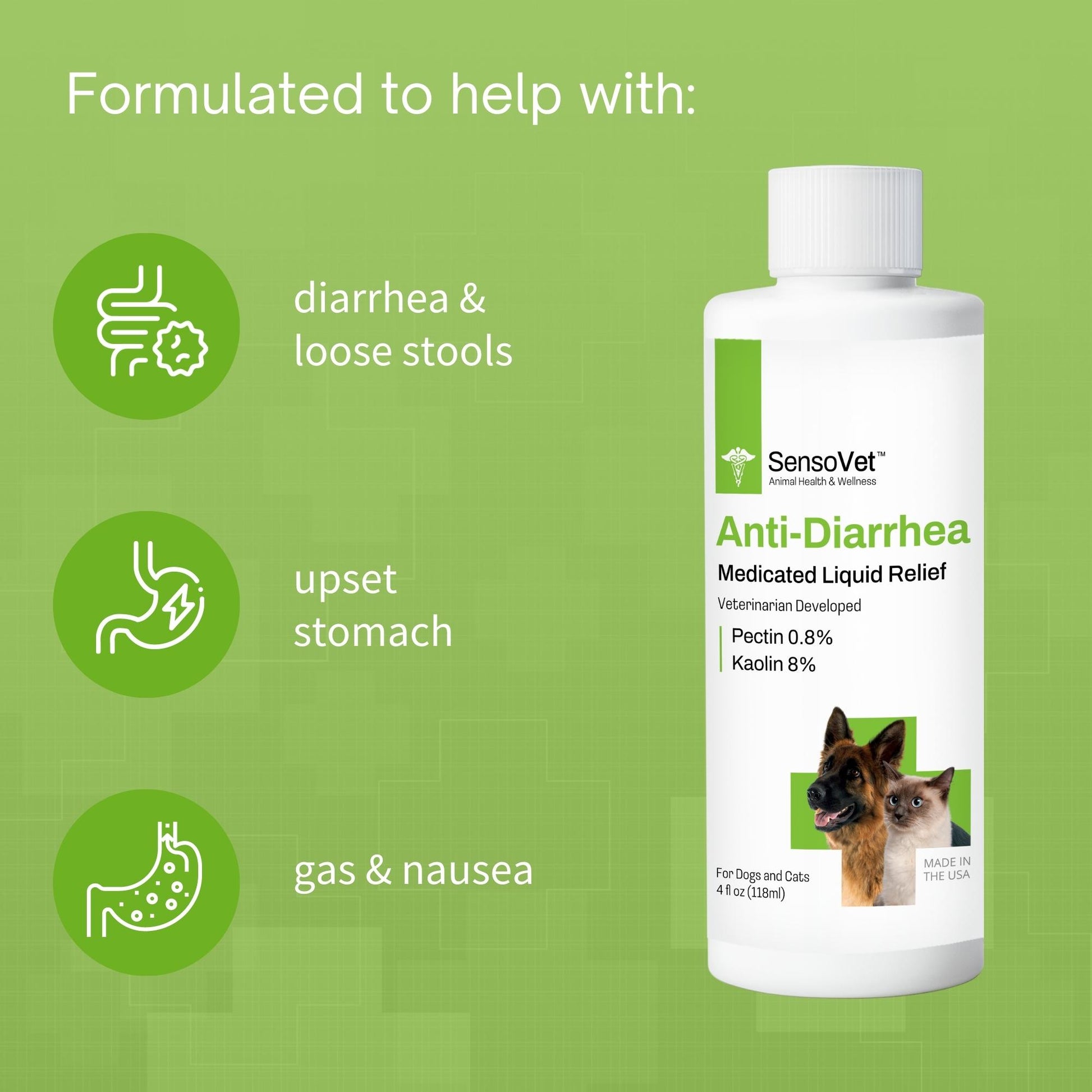 SensoVet™ Anti-Diarrhea Liquid Relief is formulated to help alleviate symptoms of diarrhea, nausea, gas and other digestive issues in dogs and cats. This formula also serves as a protectant for the delicate lining of your pet's digestive tract helping calm their digestive system and supporting healthy firm stool.