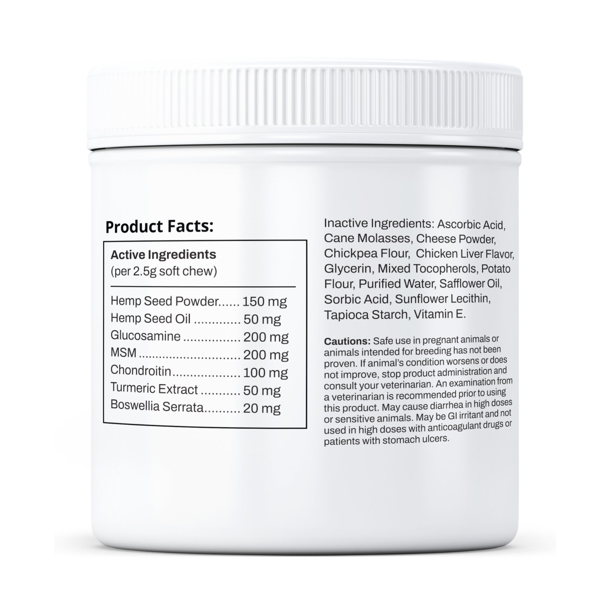 Active (per 2.5g chew): Hemp Seed Powder 150 mg, Hemp Seed Oil 50 mg, Glucosamine 200 mg, Methysulfonylmethane (MSM) 200 mg, Chondroitin 100 mg, Turmeric Extract 50 mg, Boswelia Serrata 20 mg