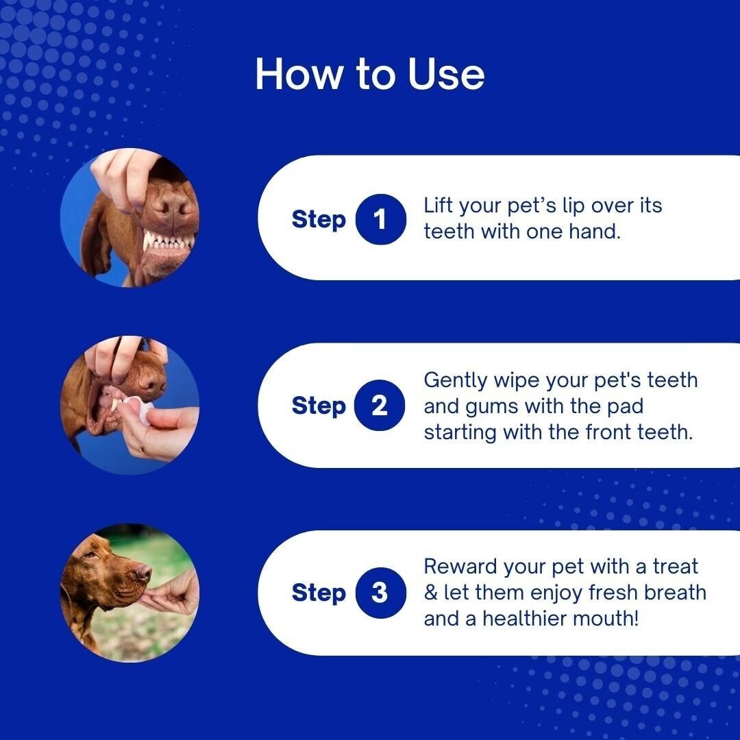 Gently wipe front to back on both sides of your pet's teeth and gums. Recommended to use twice daily or after meals.