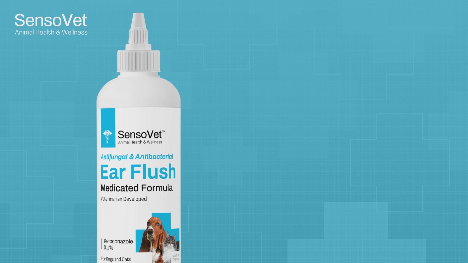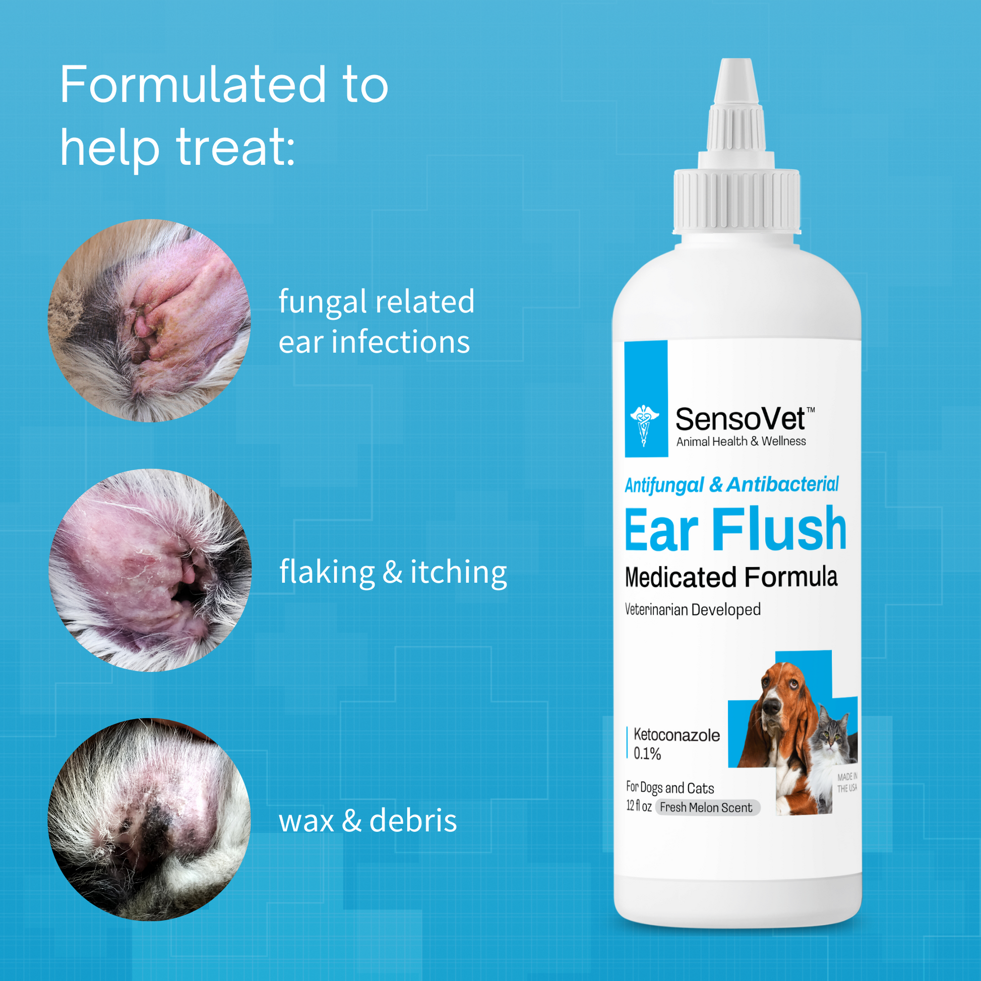 Sensovet⢠Medicated Ear Flush is designed to effectively treat the root cause of fungal related ear infections providing rapid relief to your pet's ears. Our formula contains Ketoconazole which helps eliminate itching, infections, and smell while gently removing debris, wax & flaking. Take control of your pet's ear health today with our simple yet powerful flush.