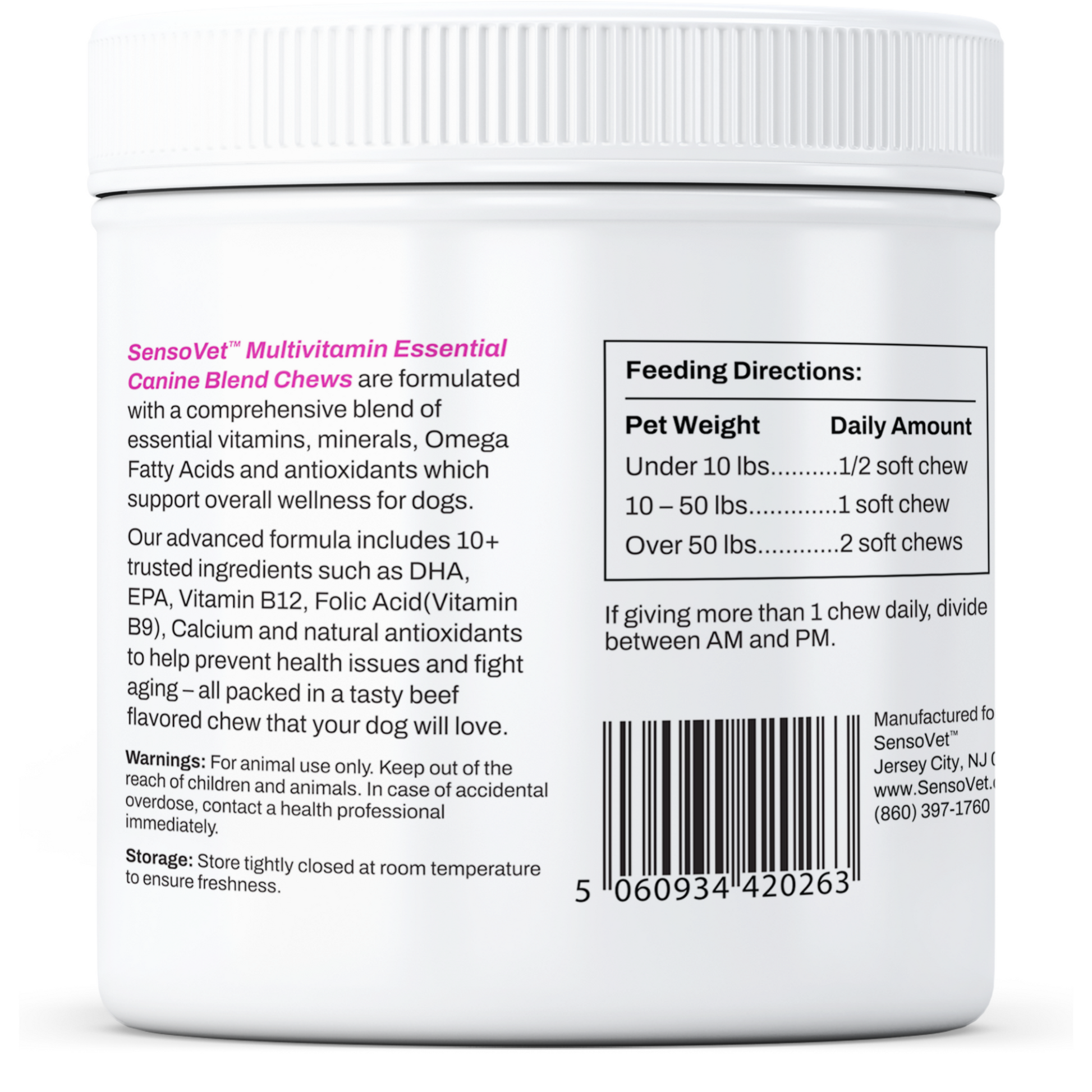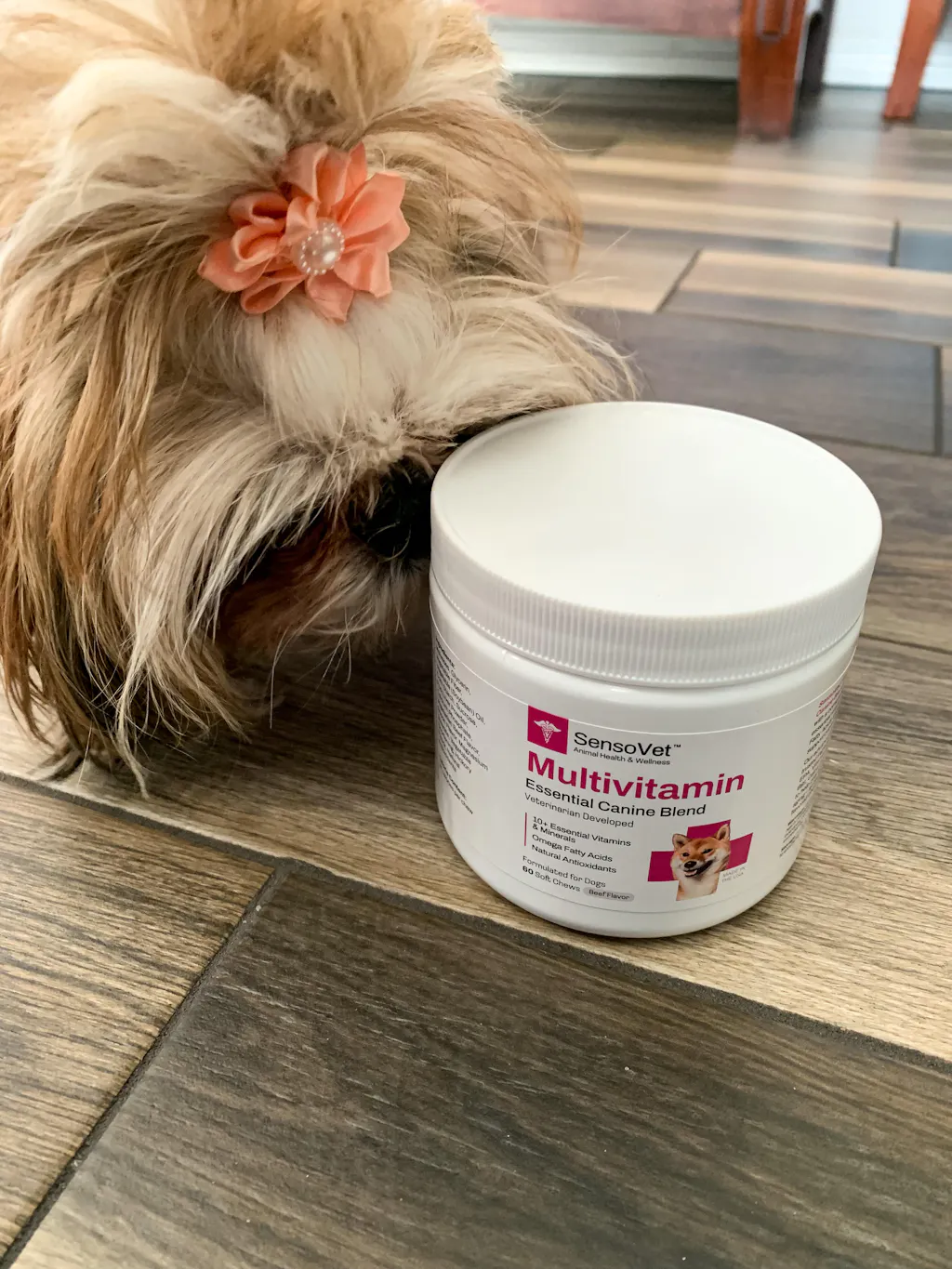SensoVetâ„¢ Multivitamin chew are formulated with a comprehensive blend of essential vitamins, minerals, Omega Fatty Acids and antioxidants which help support overall wellness with every tasty beef flavored chew. Our advanced formula includes 10+ trusted ingredients including DHA, EPA, Vitamin B12 and Folic Acid (Vitamin B9), Calcium & more to prevent health issues and fights aging with powerful antioxidants. Formulated specifically for dogs.