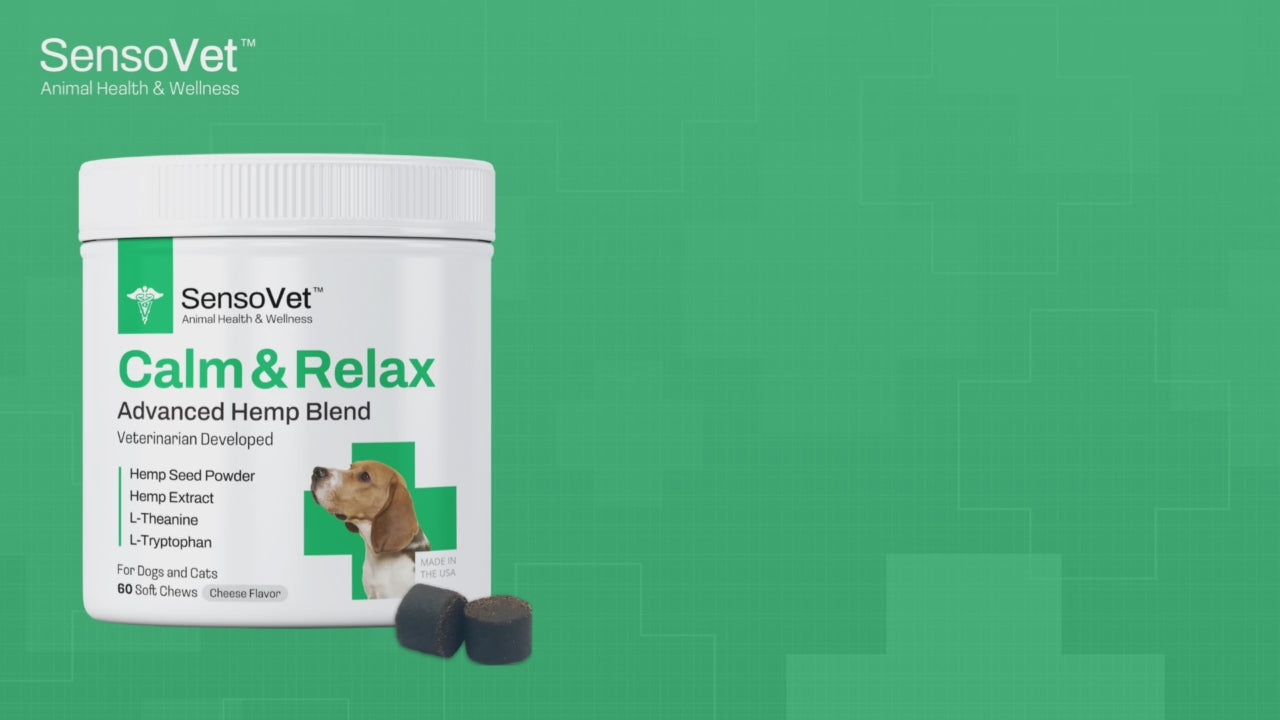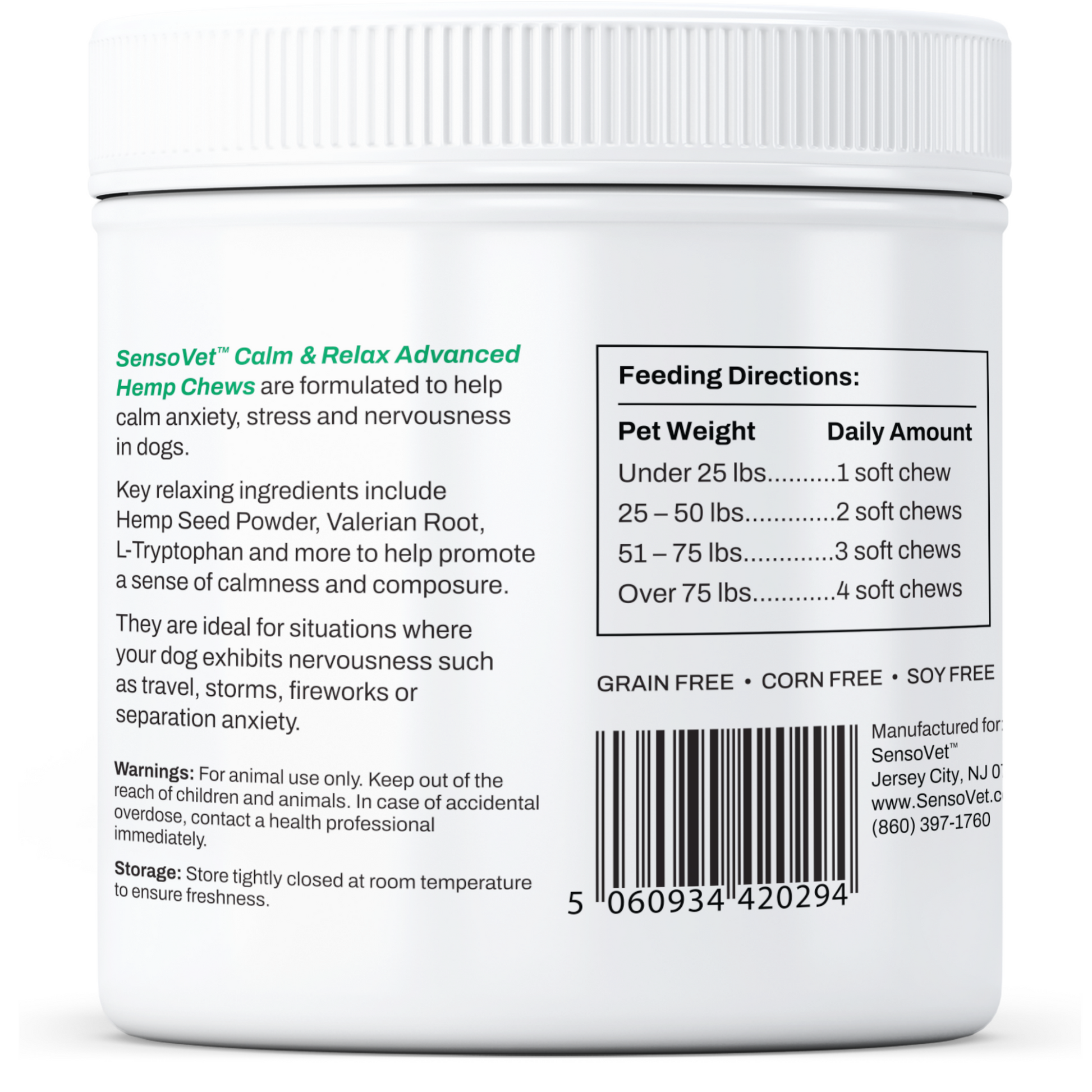 SensoVet⢠Calm & Relax Advanced Hemp Chews are formulated to help calm nervousness in dogs. Our chews are formulated with key relaxing ingredients such as Hemp Seed Powder, Valerian Root, L-Tryptophan & more which help promote a sense of calmness and composure. They are ideal for situations where your dog exhibits nervousness such as travel, storms, fireworks or separation anxiety.