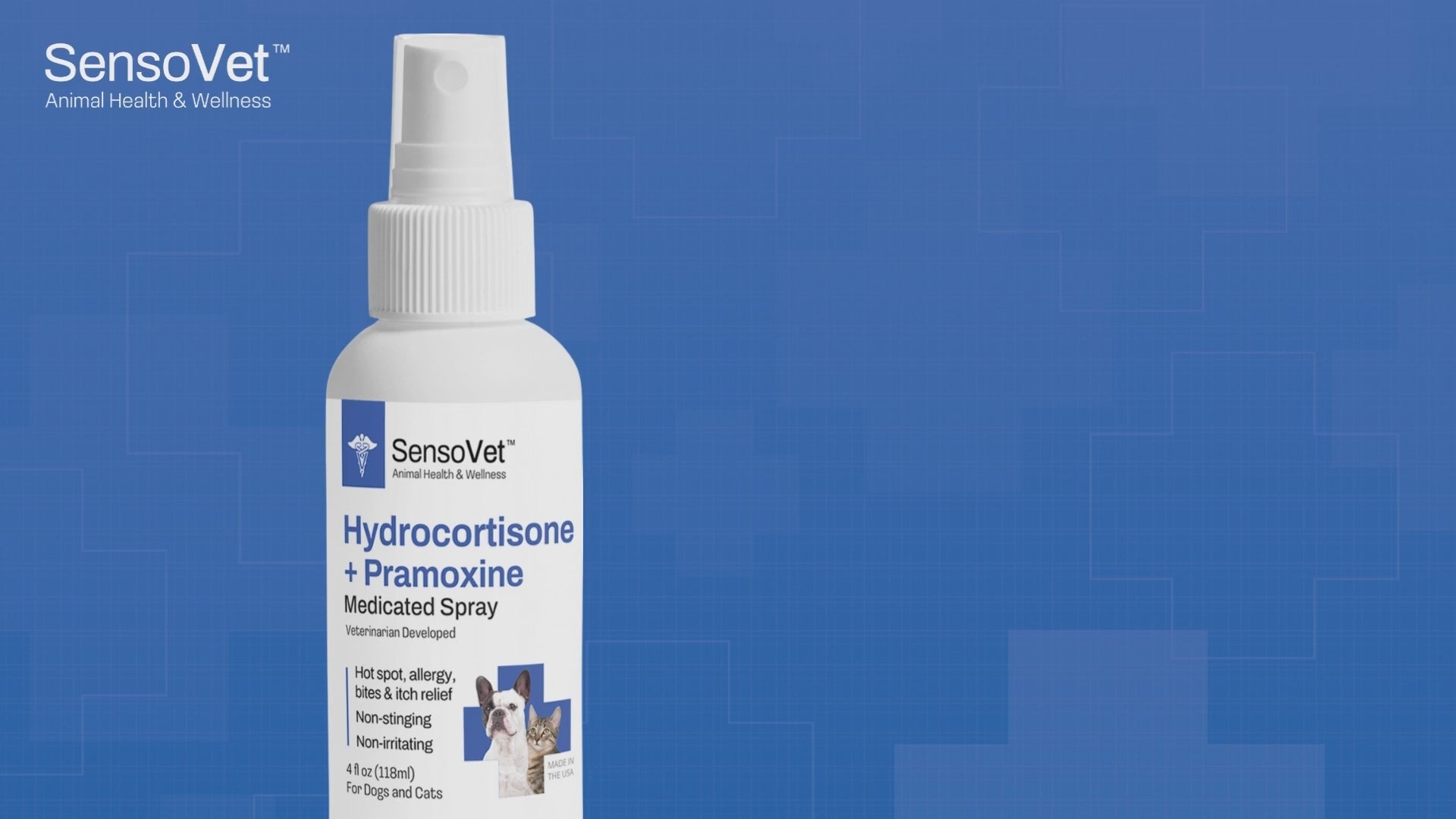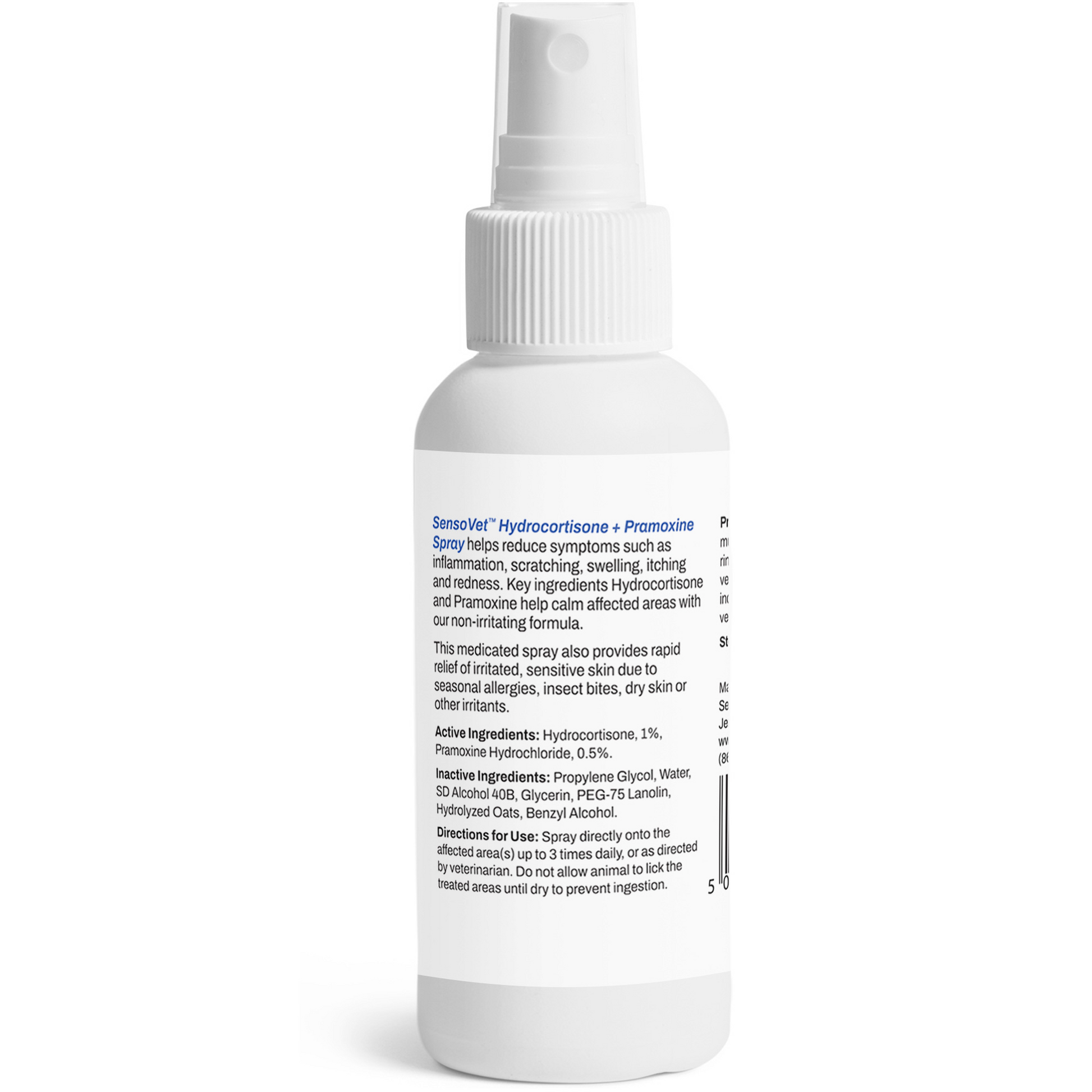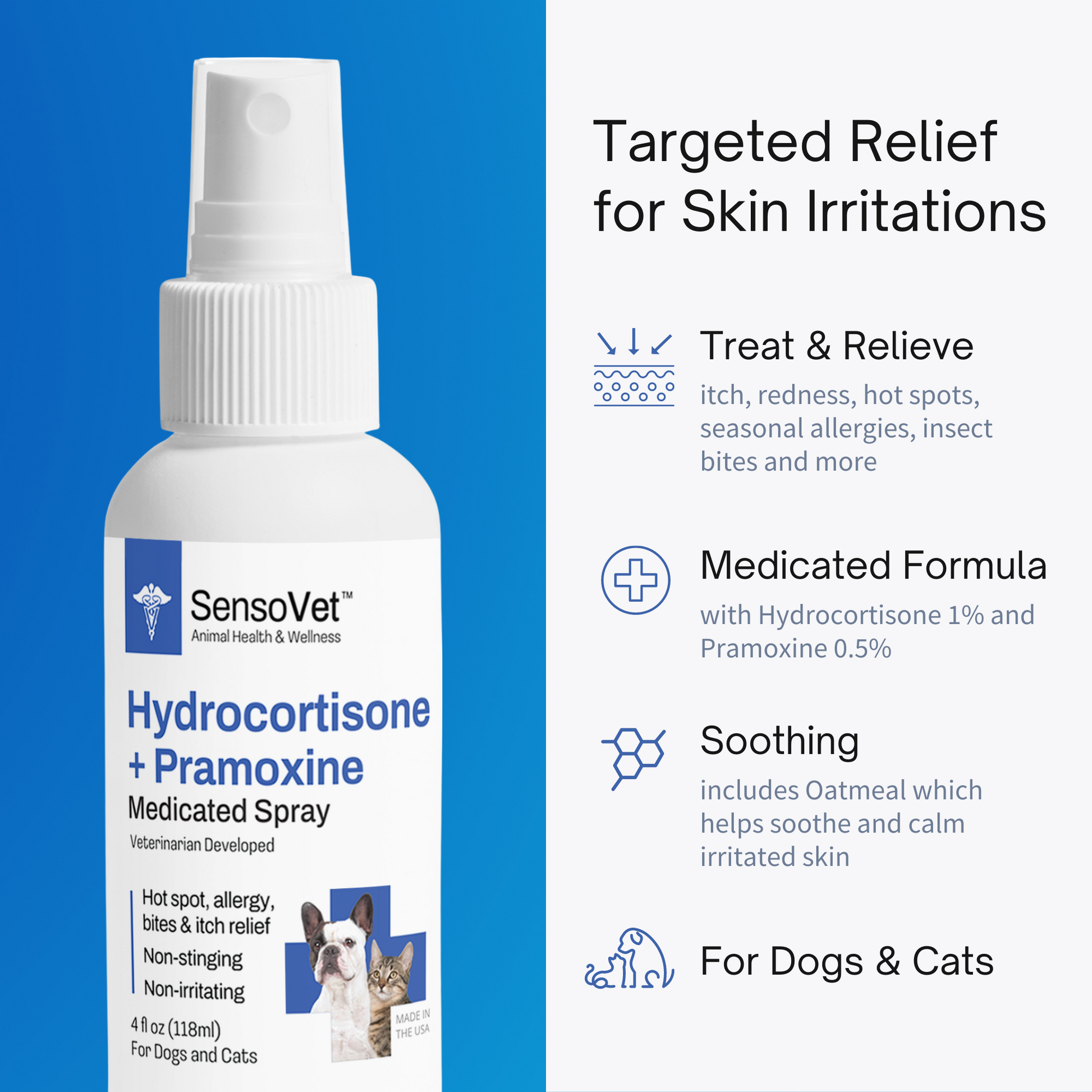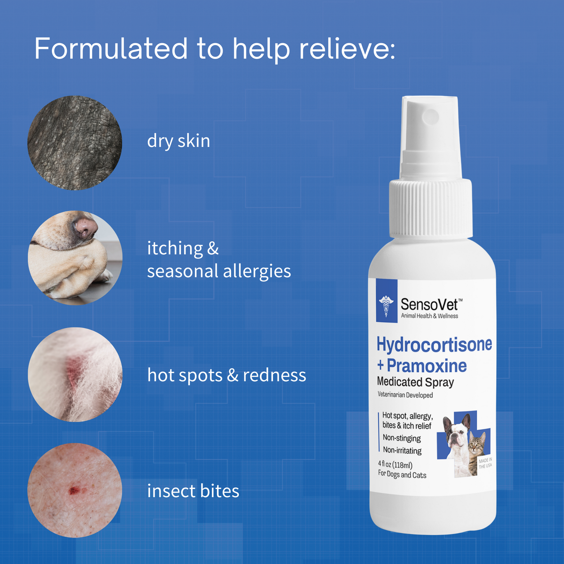SensoVet™ Hydrocortisone & Pramoxine Spray helps reduce symptoms such as inflammation, scratching, swelling, itching and redness in dogs and cats. Our medicated spray also provides rapid relief of irritated skin due to seasonal allergies, insect bites, dry skin & other irritants. Targeted hotspot relief is formulated with key active ingredients Hydrocortisone & pramoxine which calm affected areas. Formulated for dogs & cats.