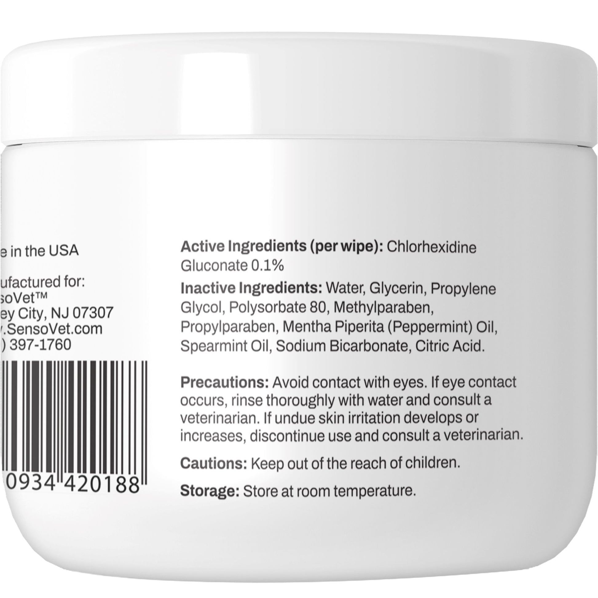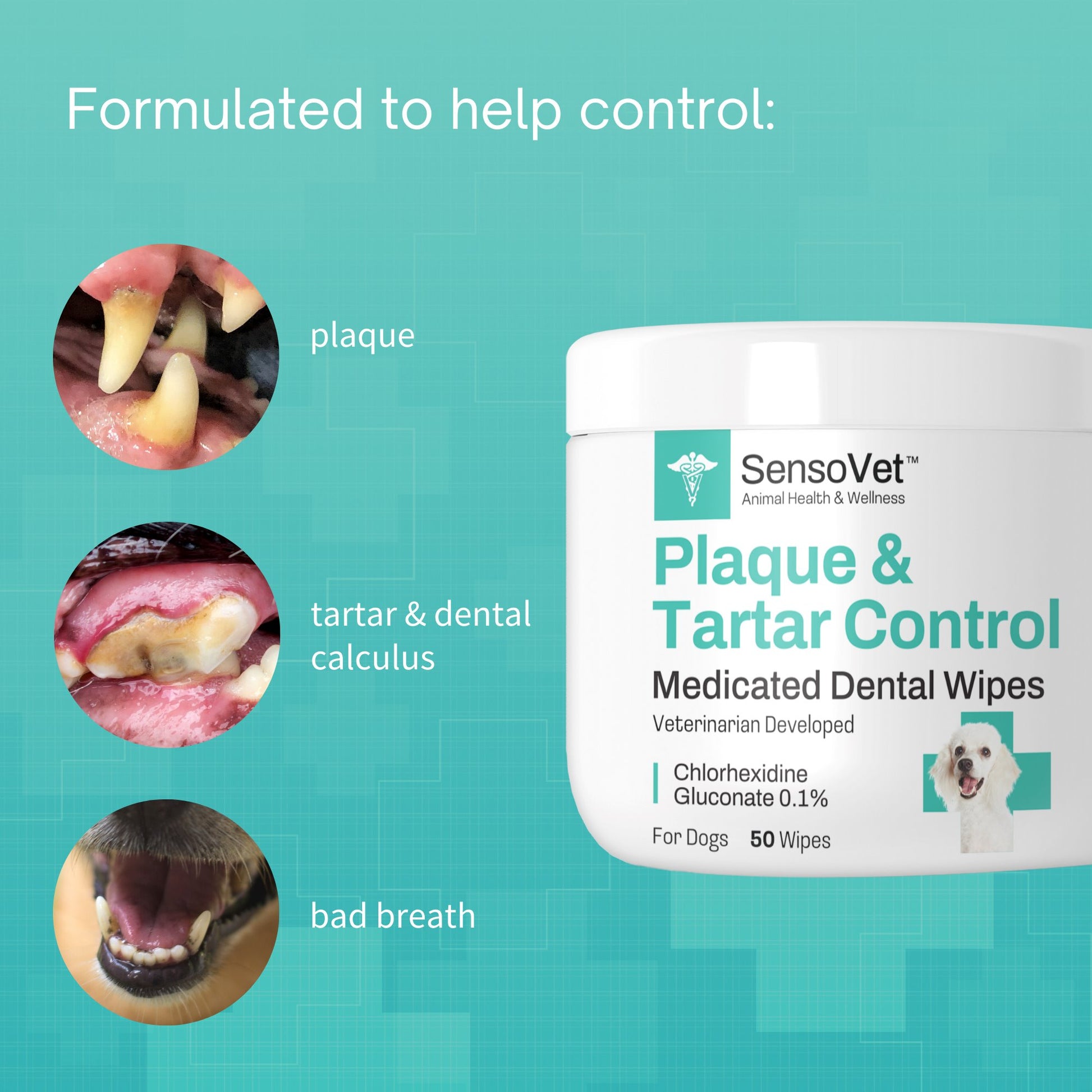 SensoVetâ„¢ Medicated Dental Wipes for Dogs Are formulated with antimicrobial properties to help reduce plaque, dental calculus & tartar buildup on your dog's teeth. Our fuss-free solution is safe for daily use & helps eliminate problem bacteria that causes bad breath. These durable, textured pads are tear-resistant and can be used directly on teeth and gums. Regular dental care helps prevent dental disease and leads to a higher quality of life.